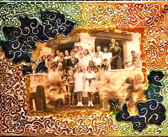 De trouwfoto van mijn ouders, versierd met batikpatronen.